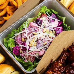 Juicy Lamb Patty on a bed of lettuce and tomato, smothered with homemade curry remoulade and topped with mango chutney on a honey oat bun
